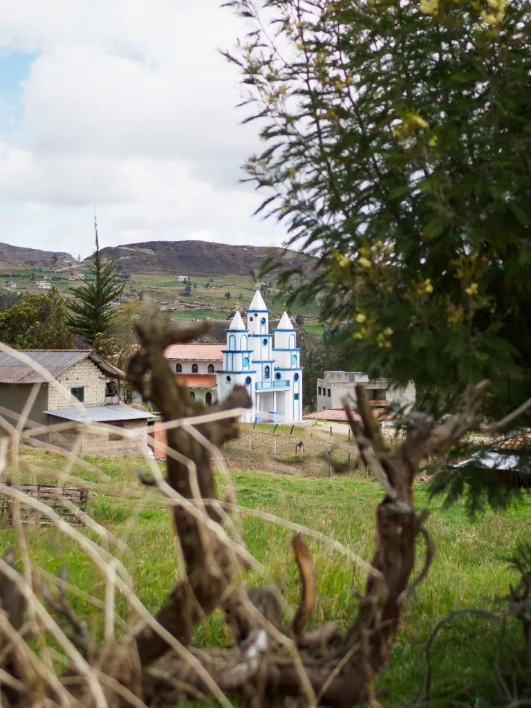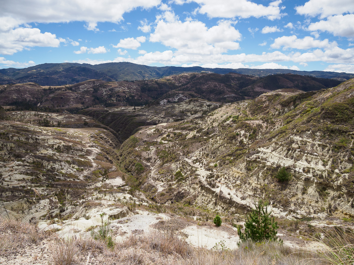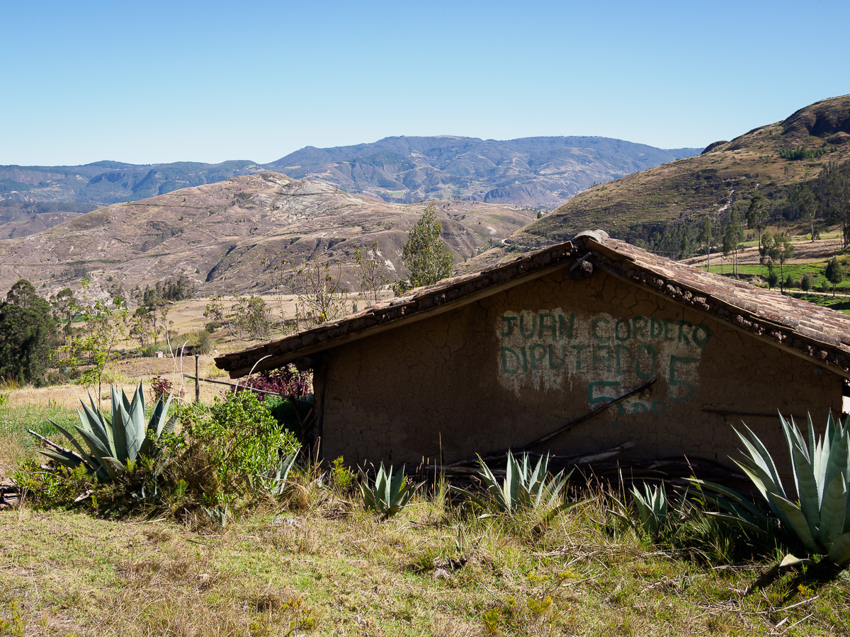 La piste traverse des villages fantômes, aux airs de western. Il ne manque plus que la musique du « bon, de la brute et du truand »: églises blanches, maisons aux balcons de bois et aux façades décrépies, soleil de plomb et air chargé de poussière. Sur les murs des écoles, nous lisons des messages de santé publique ou d’éducation. Les canyons environnants se piquent tâches vert argenté : des plantes d’agave, dont les locaux font une téquila équatorienne. Quand nous nous arrêtons demander de l’eau à un couple au fond d’une vallée, nous repartons avec un kilo d’oranges et des oeufs pour notre « merienda » ou repas du soir. Bel exemple de la générosité équatorienne.