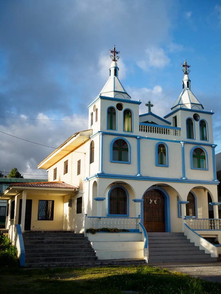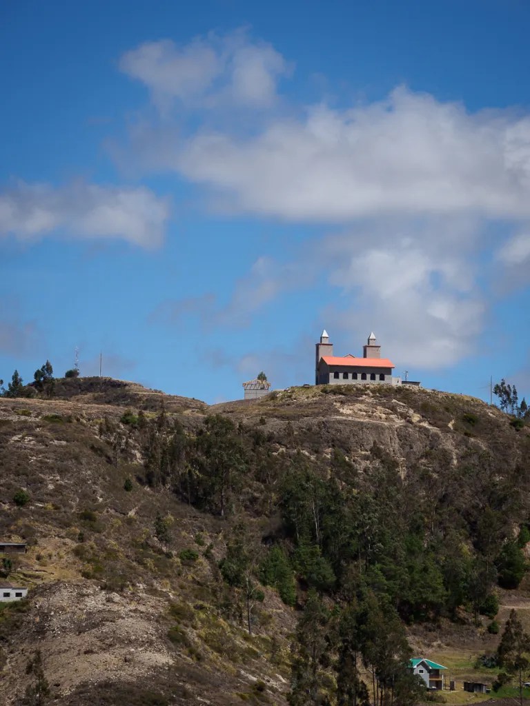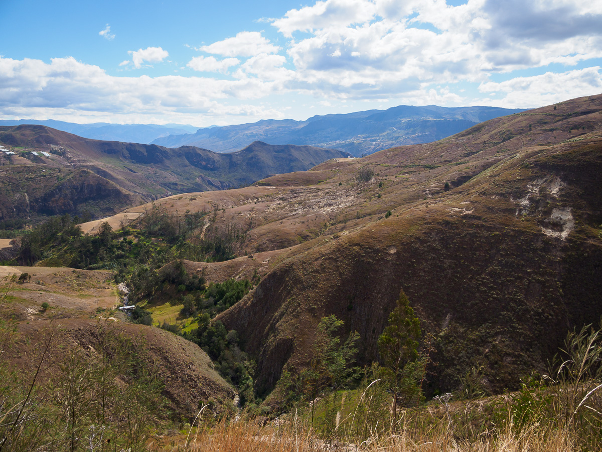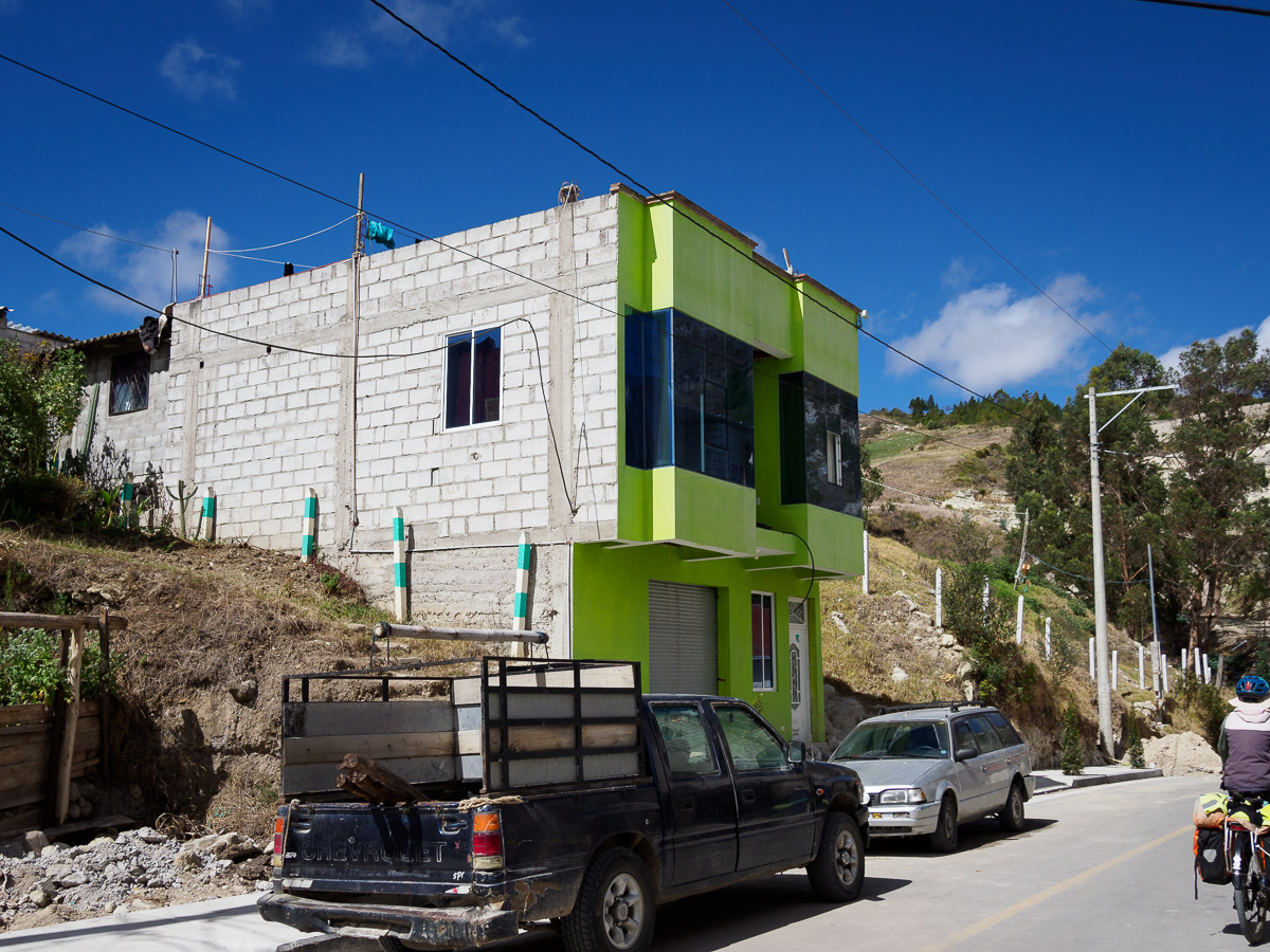 La piste traverse des villages fantômes, aux airs de western. Il ne manque plus que la musique du « bon, de la brute et du truand »: églises blanches, maisons aux balcons de bois et aux façades décrépies, soleil de plomb et air chargé de poussière. Sur les murs des écoles, nous lisons des messages de santé publique ou d’éducation. Les canyons environnants se piquent tâches vert argenté : des plantes d’agave, dont les locaux font une téquila équatorienne. Quand nous nous arrêtons demander de l’eau à un couple au fond d’une vallée, nous repartons avec un kilo d’oranges et des oeufs pour notre « merienda » ou repas du soir. Bel exemple de la générosité équatorienne.
