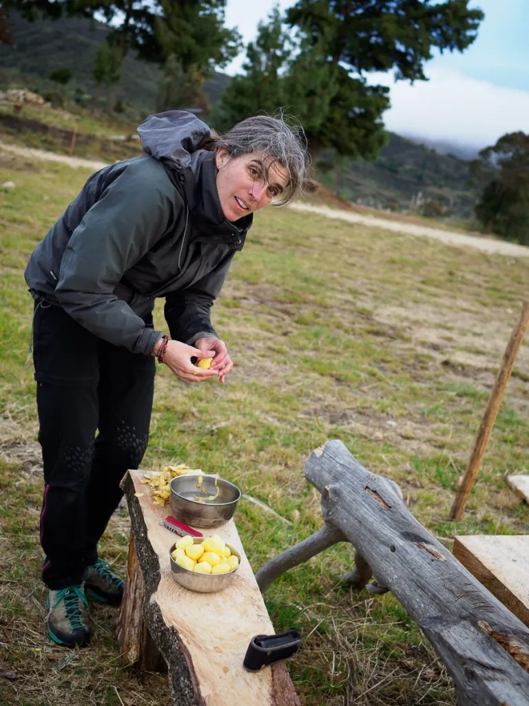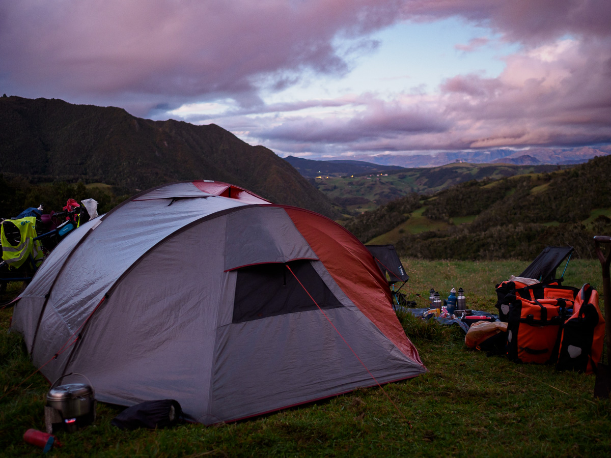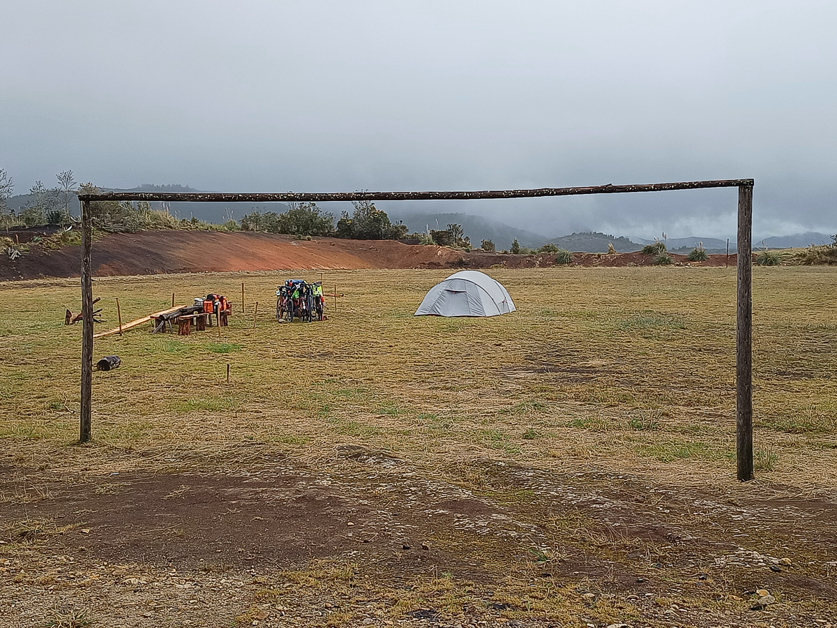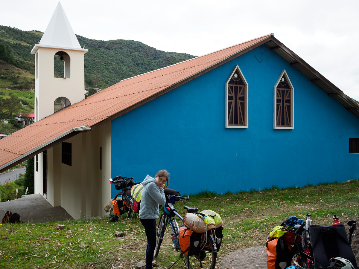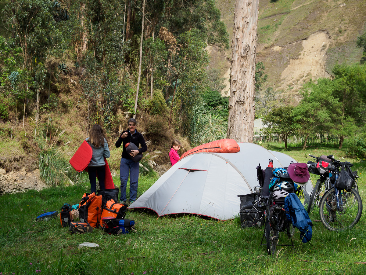 Nous commencons par grimper au mirador de Turi, pour un au revoir à Cuenca et nous arrêtons quelques kilomètres plus loin dans la cour d’une école. On en profite avant la rentrée des classes. La vue est superbe et la nuit calme. Le temps est incertain et nous passerons la journée à enlever et remettre nos affaires de pluie. Après un ravitaillement dans le village de Tarqui, nous grimpons sur une piste raide. Le dimanche semble un jour de rassemblement dans les campagnes autour de travaux communautaires. Ici, les habitants repeignent ensemble l’église, un peu plus loin, c’est un tournoi de foot entre villages qui animent la colline. Nous poursuivons au milieu des pâturages sous une pluie fine mais désagréable qui s’installe….plus nous montons, plus l’habitat devient simple et minimaliste. Nous rejoignons une zone où les champs ouverts jusque là mais abrupts, deviennent plus plats mais cloturés. Nous nous abritons sous un grand conifère pour laisser passer l’averse… la nuit commence à tomber et derrière le portail qui nous fait face, le terrain est plat… miné de bouses de vache fraîches mais plat. On ne peut pas tout avoir!! Nous demandons à la famille si nous pouvons camper. Sceptique devant le confort de notre prochaine nuit, ils acceptent volontiers et nous amènent de suite une tisane et des tortillas. Cette famille vend son fromage frais, le quesillo, à un vendeur ambulant qui s’arrête justement devant nous. Après quelques mots echangés, ce dernier nous en offre…2 kilos!! Impossible de parlementer avec lui, alors nous en offrirons à notre tour le lendemain. Nous mangeons dans le noir mais presque au sec si ce n’est nos pieds trempés par le sol spongieux.