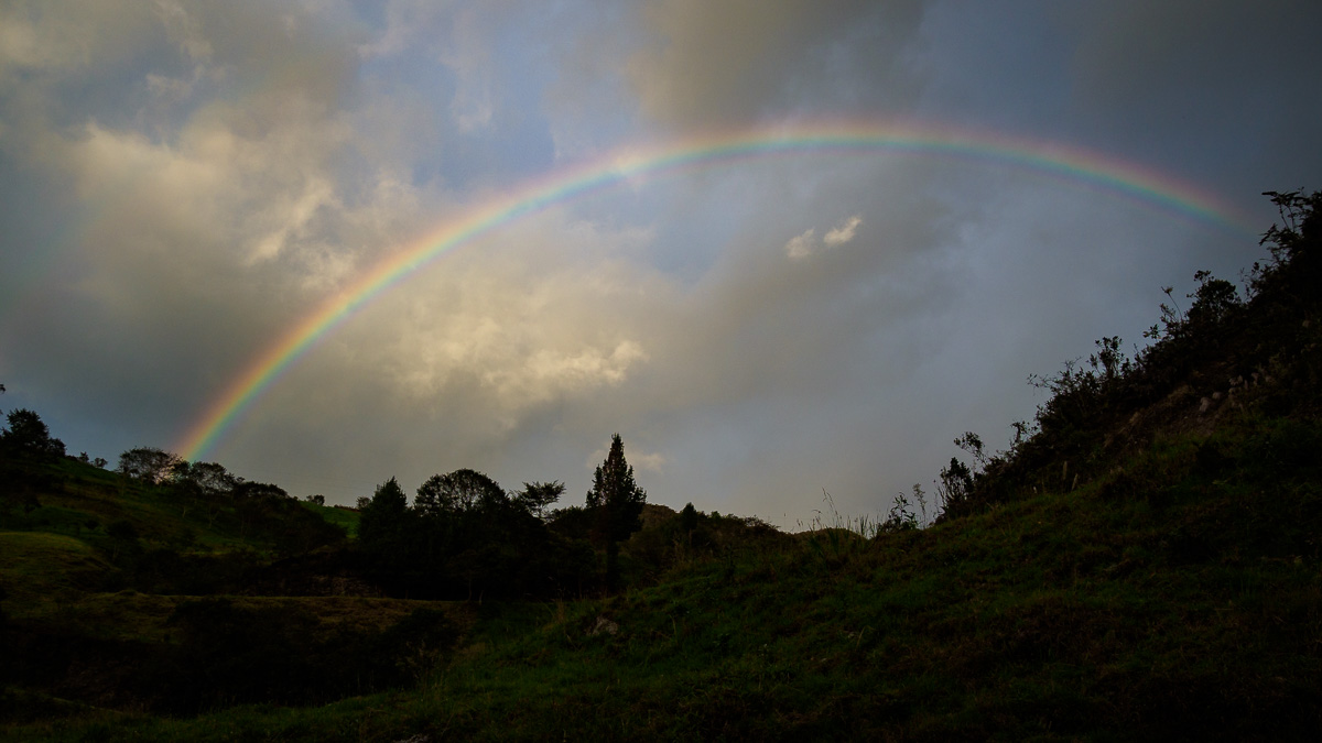 Il pleuvra toute la nuit, pas une pluie diluvienne qui réveille, mais une fine bruine qui berce doucement nos rêves. Nous restons au chaud un peu plus longtemps que d’habitude, attendant une éclaircie… un instant plus lumineux, le ciel se couvre à nouveau et c’est une nouvelle vague de gouttelettes. Et le soleil revient pour disparaitre encore. Nous sommes aussi indécis que le temps. Nous hésitons entre rester pour profiter du coin avec le soleil ou redescendre doucement pour essayer de passer sous les nuages. La seconde option l’emporte!! La piste se poursuit donc au coeur de ce paramo équatorien, sorte de brumisateur naturel. Il y à la fois du soleil, un ciel bleu et de la pluie… il n’y a qu’ici que l’on voit ça….