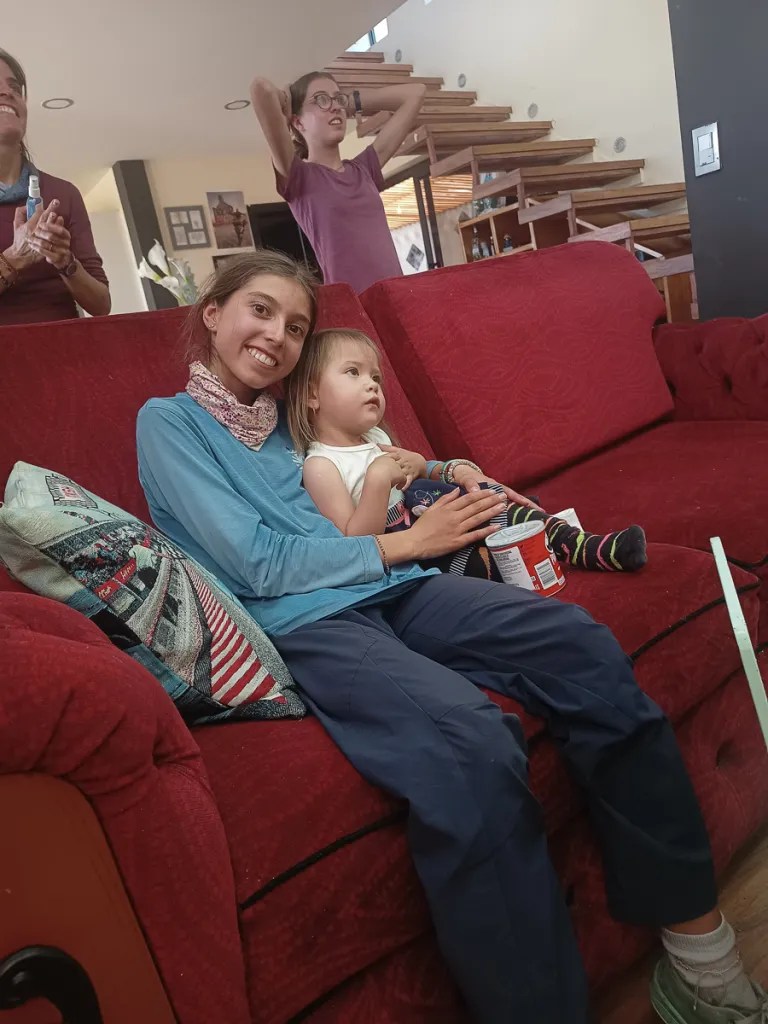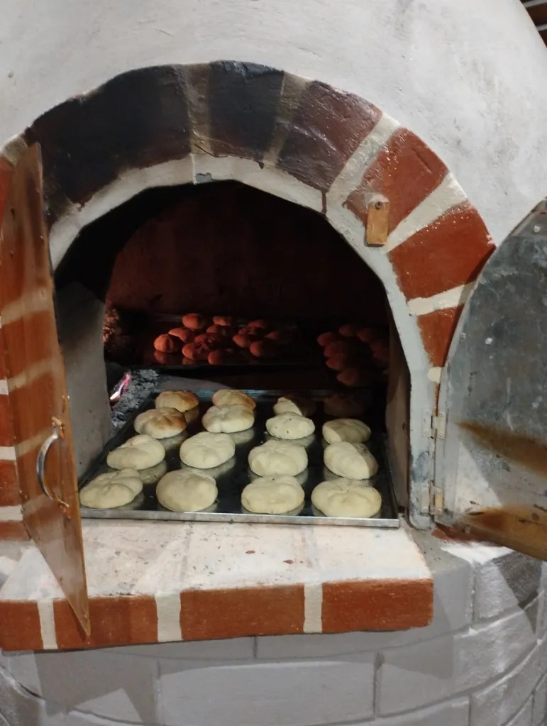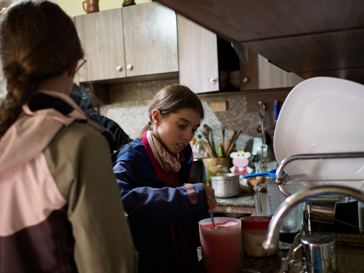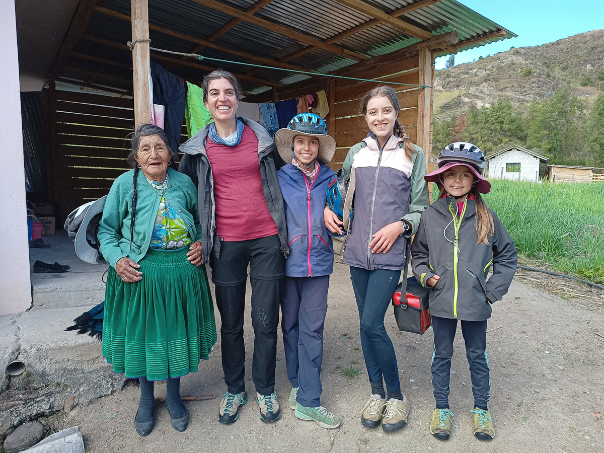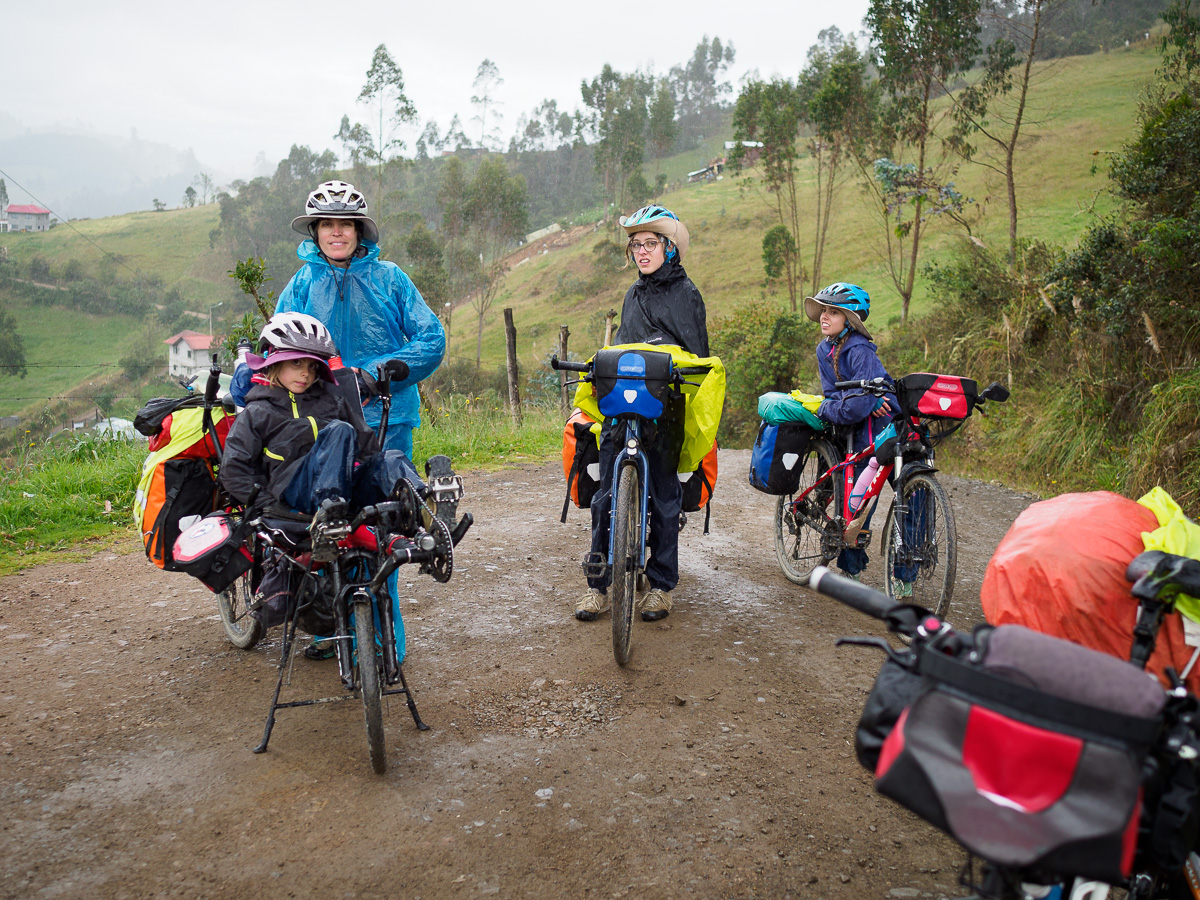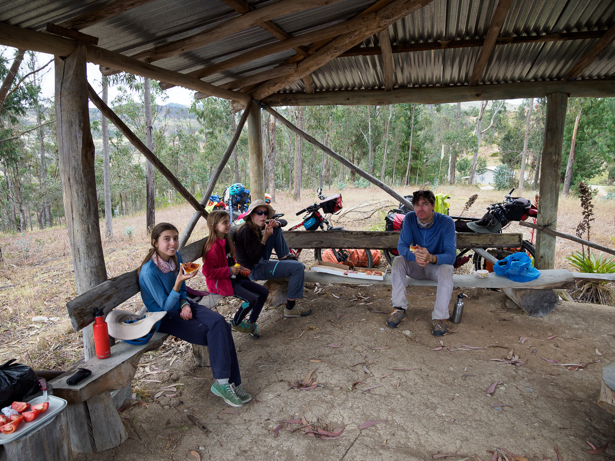 Nous dévorons une soupe et un plat de poulet en sauce/riz/pommes de terre, avec vue sur le parc et ses maisons authentiques. Les filles jouent sur la place avec Javiera et Maria Antonia, deux petites équatoriennes. Isabel, leur maman nous invite à nous reposer chez eux jusqu’au lendemain. Les filles sautent de joie ! Je crois que Damien avait envie de rouler aujourd’hui, mais on ne résiste pas au sourire chaleureux d’Isabel et à la joie simple et spontanée des enfants (et de moi-même !). Isabel et ses tantes nous apprennent à confectionner le « pain maison » équatorien dans le four à bois de la maison. La pâte, à base de farine, de levure, d’oeufs, de graisse de porc, de sucre et d’anis est longuement malaxée et travaillée. Nous formons consciensieusement des petites boules que nous creusons ensuite pour les fourrer de fromage frais ou quesillo. Les pains sont ensuite aplatis et enfournés. A l’odeur du bois d’eucalyptus qui brûle, se mêlent alors les alléchantes éffluves de la pâtisserie. Les pains chauds sont un délice et les déguster au sein de cette belle famille un privilège. Nous goûtons aussi un délicieux fromage au basilic produit par le cousin d’Isabel, à la saveur fruitée et alpine ! Nous repartons avec une tome dans les sacoches ! Manon et Samantha, les grandes des fratries, nous régalent de pizzas maison, qui embaument la famille et le partage. Merci infiniment pour tout les amis! Nous repartons comme à chaque fois un peu plus riches de ces moments précieux, le coeur débordant de souvenirs et d’émotions.