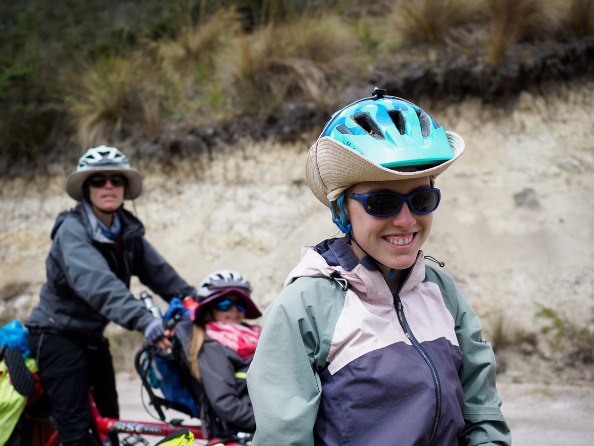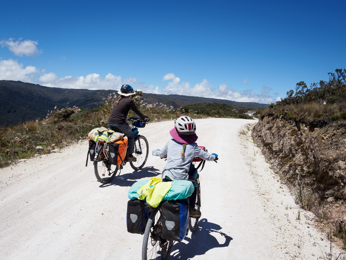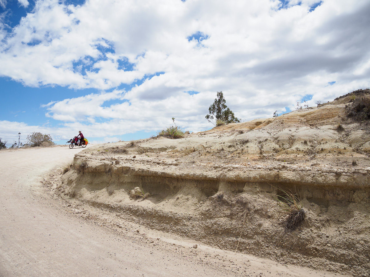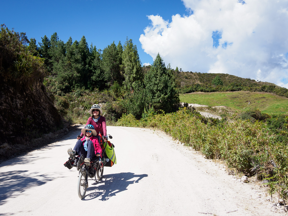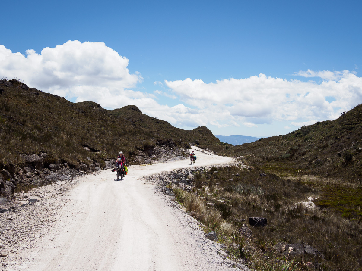 Au réveil, Lucie a le ventre en marmelade. Elle prend la place d’Héloïse sur le tandem et je lui épargne le pédalage dans la montée. Elle pourra vraiment se reposer dans les descentes qui sont loin d’être faciles sur ces terrains caillouteux. Nous sommes contents de pouvoir réaliser ces échanges de monture, cela justifiant notamment nos choix de vélo ! En fait, Lucie marchera beaucoup car la pente est trop raide pour pédaler. Mais quelle beauté autour de nous ! Depuis hier midi, nous n’avons rencontré personne. Partout où porte notre regard, il n’y a qu’étendue sauvage. Pas de culture ici, pas de villages, rien que la nature (presque) à l’état brut. Un paramo à la végétation rase entaillé par la piste de terre d’un blanc éclatant. Et nous, reprenant notre souffle entre deux raidillons !