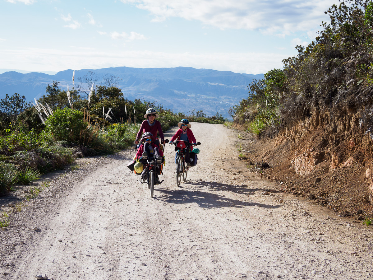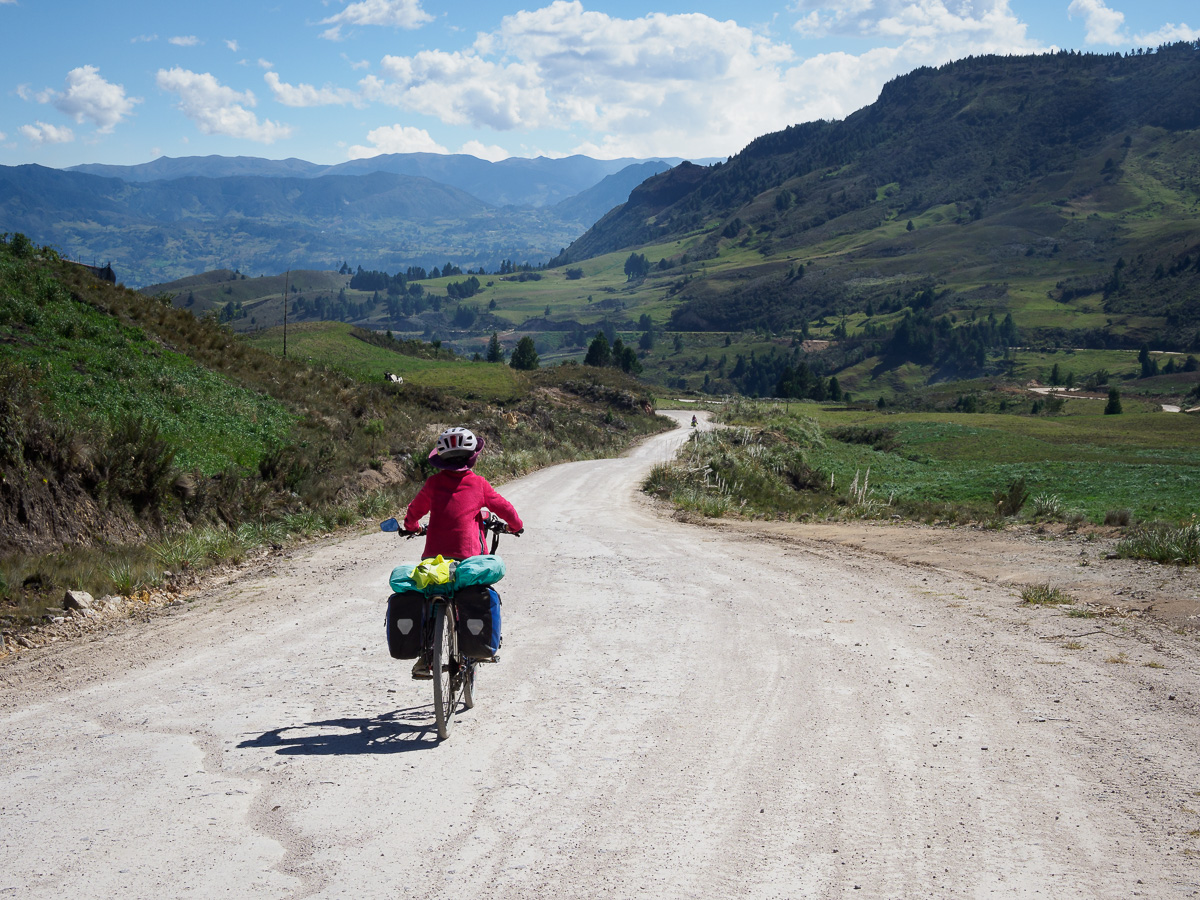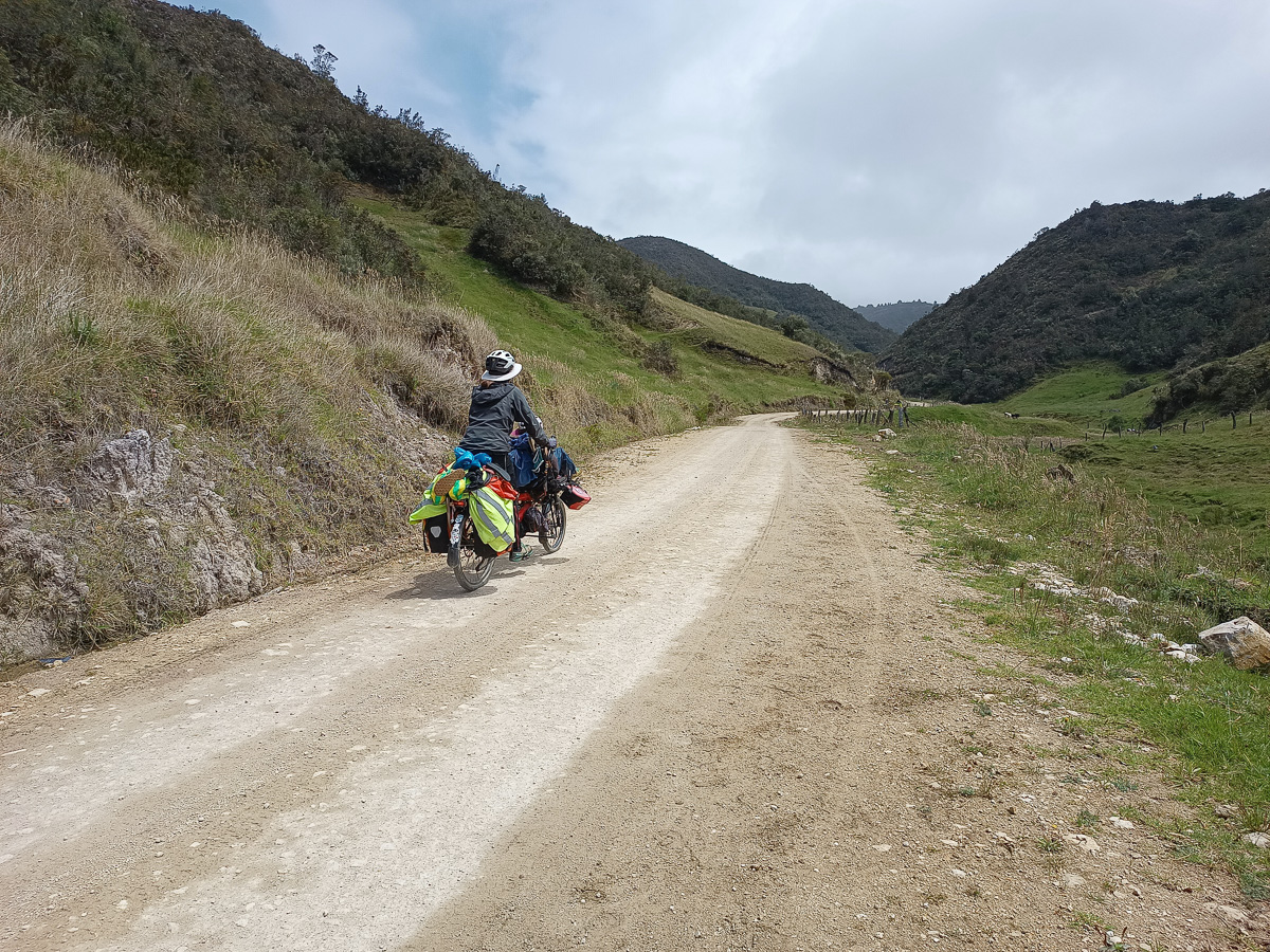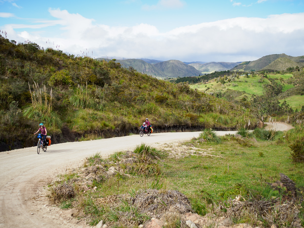 Au réveil, Lucie a le ventre en marmelade. Elle prend la place d’Héloïse sur le tandem et je lui épargne le pédalage dans la montée. Elle pourra vraiment se reposer dans les descentes qui sont loin d’être faciles sur ces terrains caillouteux. Nous sommes contents de pouvoir réaliser ces échanges de monture, cela justifiant notamment nos choix de vélo ! En fait, Lucie marchera beaucoup car la pente est trop raide pour pédaler. Mais quelle beauté autour de nous ! Depuis hier midi, nous n’avons rencontré personne. Partout où porte notre regard, il n’y a qu’étendue sauvage. Pas de culture ici, pas de villages, rien que la nature (presque) à l’état brut. Un paramo à la végétation rase entaillé par la piste de terre d’un blanc éclatant. Et nous, reprenant notre souffle entre deux raidillons !