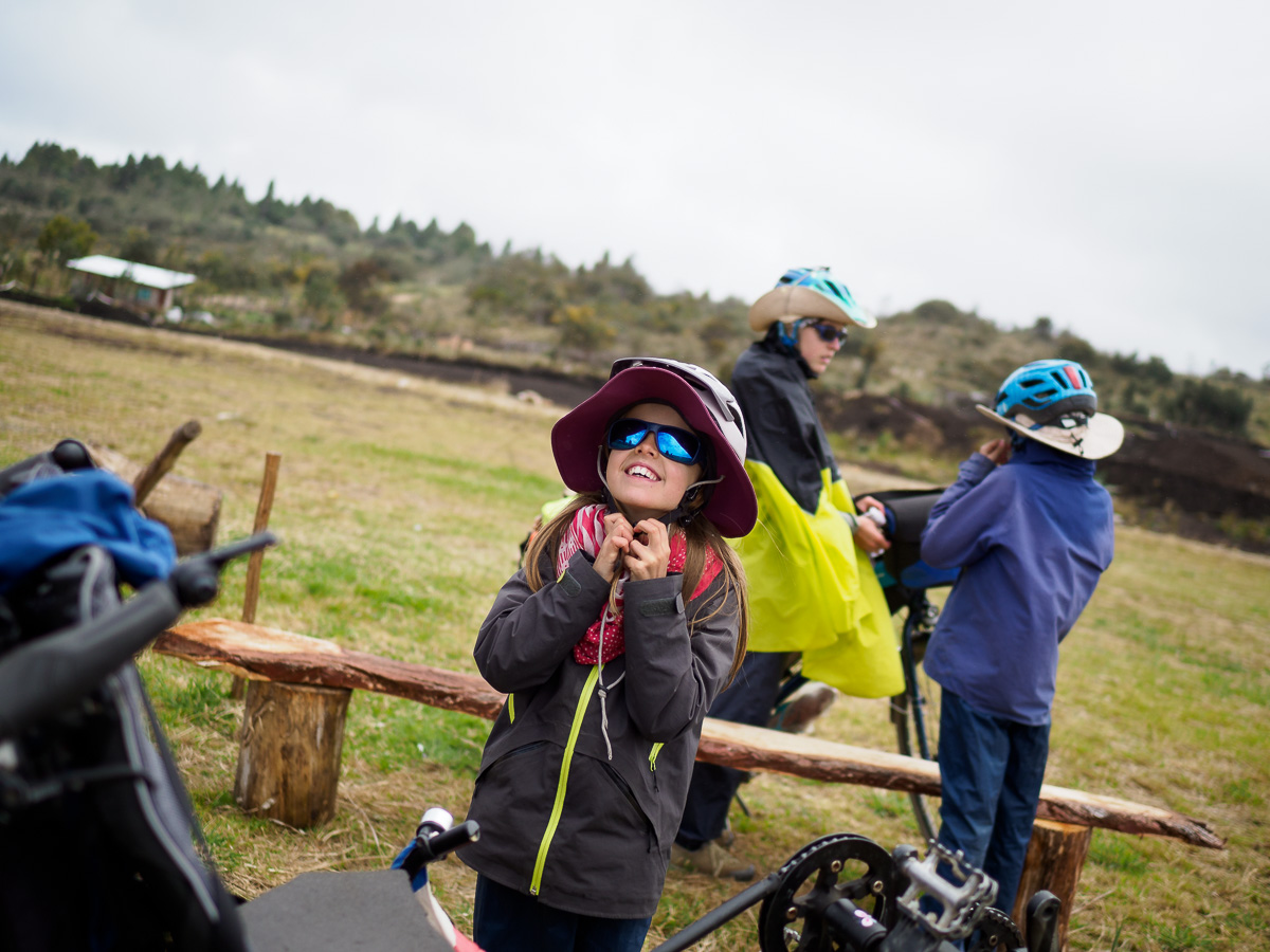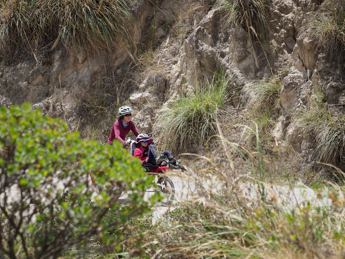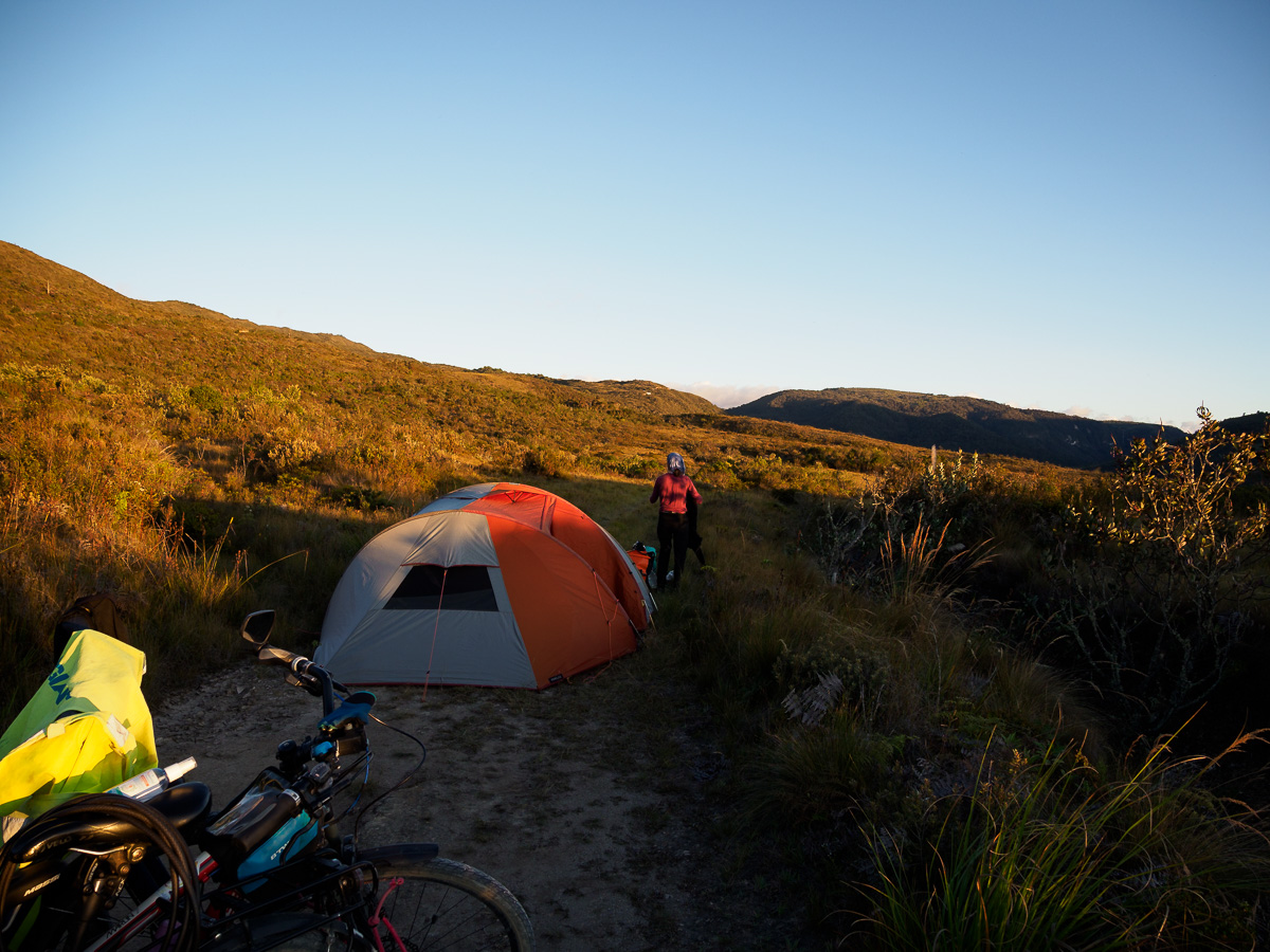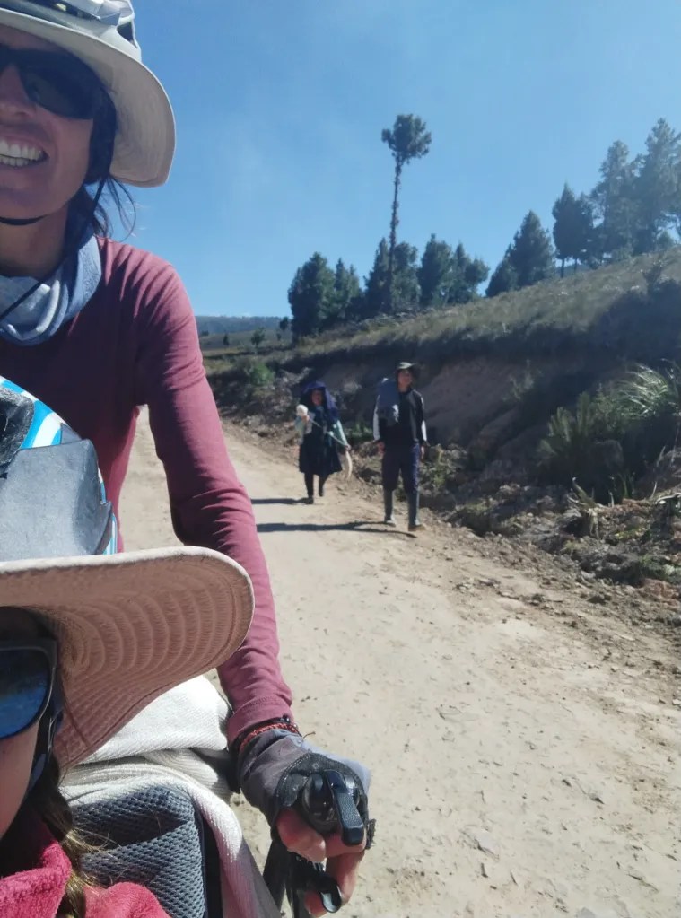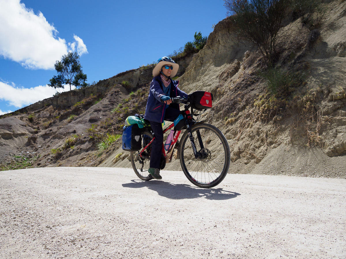 Au réveil, Lucie a le ventre en marmelade. Elle prend la place d’Héloïse sur le tandem et je lui épargne le pédalage dans la montée. Elle pourra vraiment se reposer dans les descentes qui sont loin d’être faciles sur ces terrains caillouteux. Nous sommes contents de pouvoir réaliser ces échanges de monture, cela justifiant notamment nos choix de vélo ! En fait, Lucie marchera beaucoup car la pente est trop raide pour pédaler. Mais quelle beauté autour de nous ! Depuis hier midi, nous n’avons rencontré personne. Partout où porte notre regard, il n’y a qu’étendue sauvage. Pas de culture ici, pas de villages, rien que la nature (presque) à l’état brut. Un paramo à la végétation rase entaillé par la piste de terre d’un blanc éclatant. Et nous, reprenant notre souffle entre deux raidillons !
