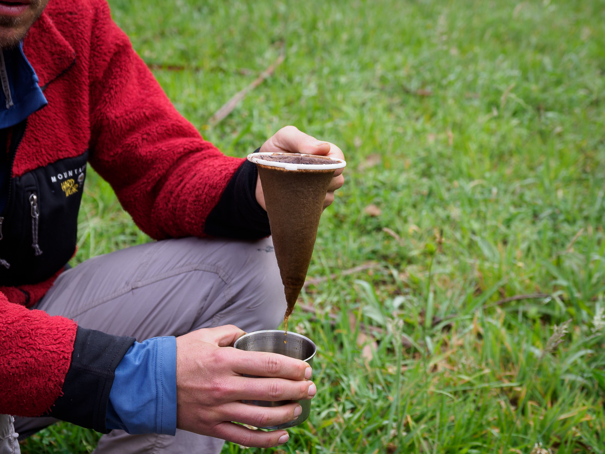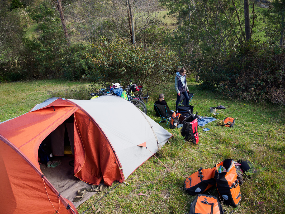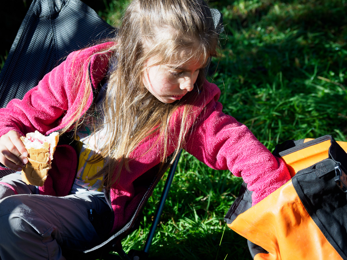 Damien, comme toujours, se lève en premier, pour déguster son café devant le ciel rosissant. J’en profite pour somnoler encore un peu ou lire sous la tente. Chacun son moment. Les filles émergent à leur tour, les yeux bouffis de rêves…. ou d’un sommeil trop hâché : nuit trop chaude, trop froide, sol trop dur, trou mal placé…. bref, les joies du camping sauvage!