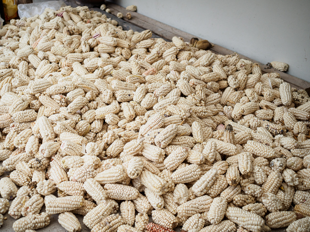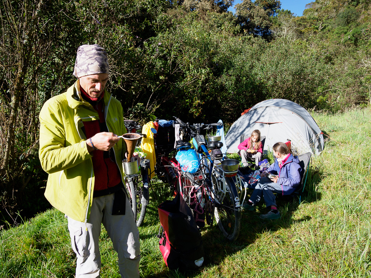 Le ruban de la piste de terre blanche grimpe à l’assaut d’un océan de verdure. Dur, dur, les pentes sont raides et nous poussons souvent les vélos! Cela nous laisse le temps d’admirer le paysage et de vivre au rythme de ces campagnes. Le vent froisse les feuilles de maïs sèches dans un doux grésillement … Des femmes égrènent des épis, un homme ramène son bétail…. Au sommet, un beau champ nous offre un bivouac avec panaroma, dont nous profitons pleinement.
