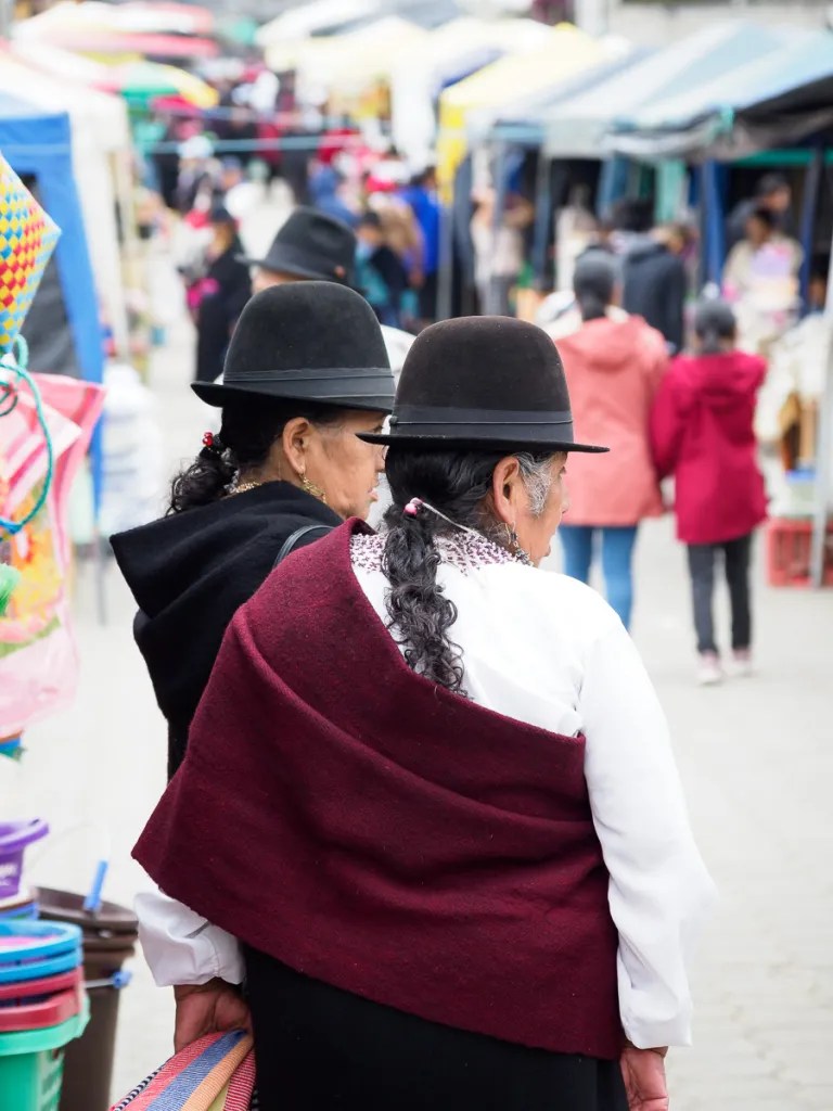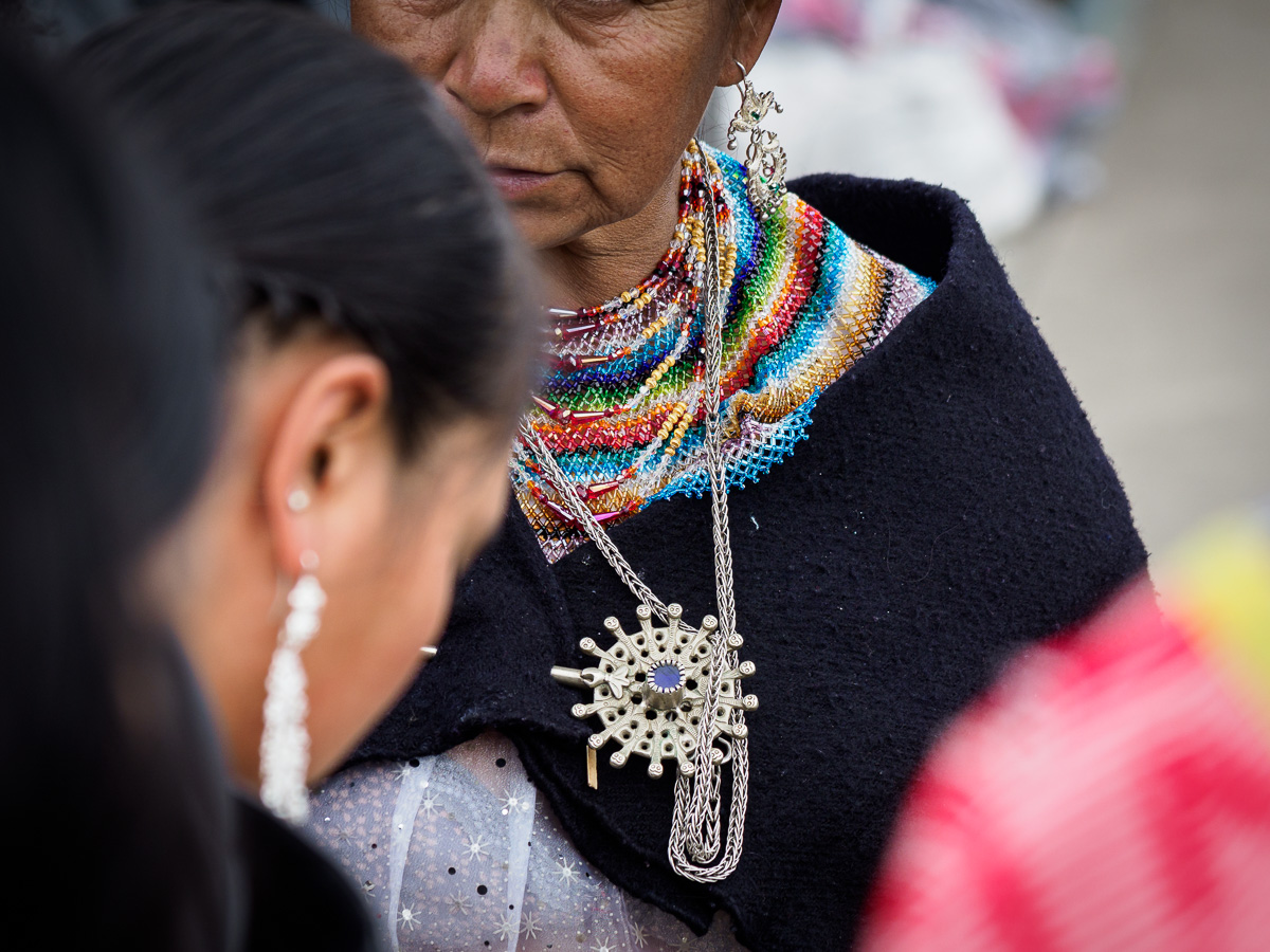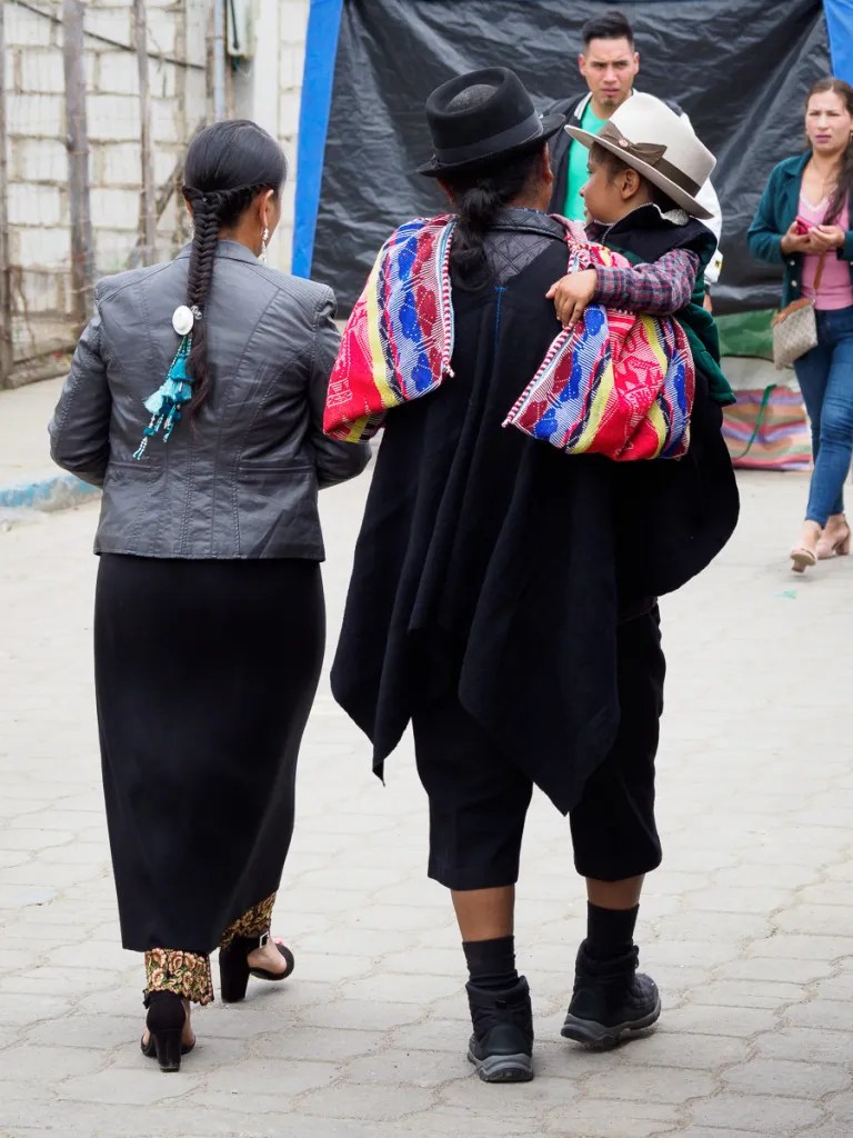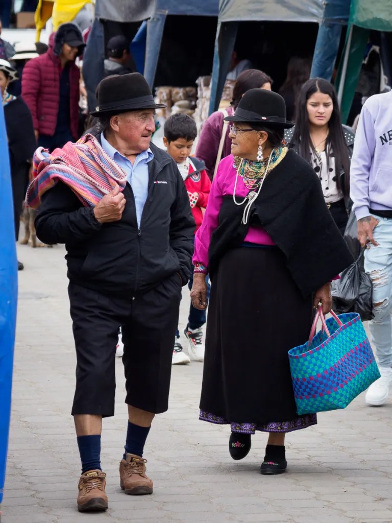 Saraguro a conservé ses traditions et est peuplé en majorité par des indiens descendants d’Incas. Ces derniers, pour coloniser les pays alentours déplacaient ses populations. C’est le cas des « Saraguros ». Hommes et femmes portent les cheveux longs et tressés en une simple natte. Les hommes sont vêtus de chemises et de pantacourts noirs. Et l’habit de femmes est un peinture à lui tout seul: une blouse brodée sur une jupe ceinturée, dont le fond est également richement décoré, une surjupe noire, droite ou évasée, un châle maintenu par un tumpa en argent, couvrant une épaule et passé sous l’aisselle, un chapeau noir et blanc en laine très dure…. La tenue est complétée par de lourdes boucles d’oreilles et des colliers de perles fines couvrant toute la gorge, brillantes ou plus sobres. Sans oublier un petit bijou de cheveux…Nous faisons un bond dans le temps. Quelque soit leur âge, les femmes portent fièrement ce costume, sans renier pourtant les commodités de notre siècle. C’est fascinant d’évoluer ici dans ce mélange de tradition et de technologie…
