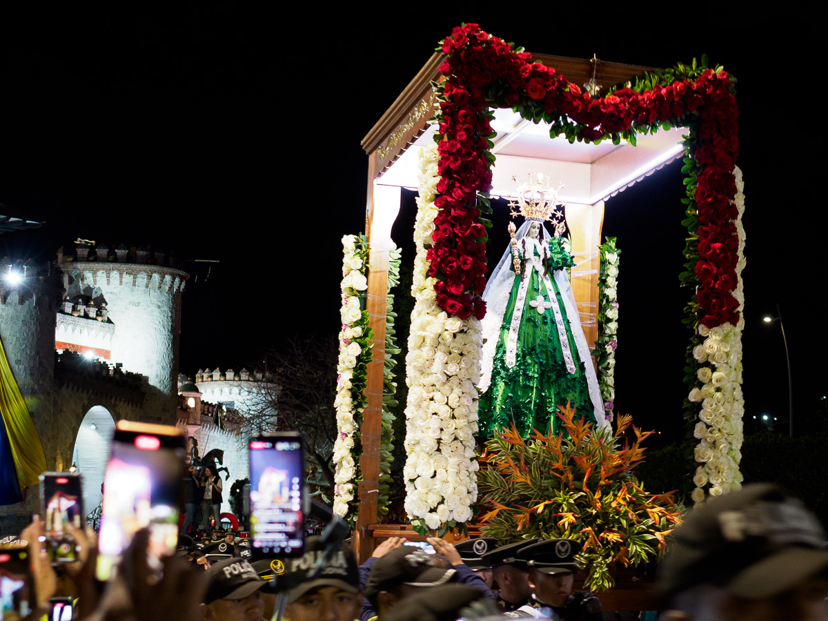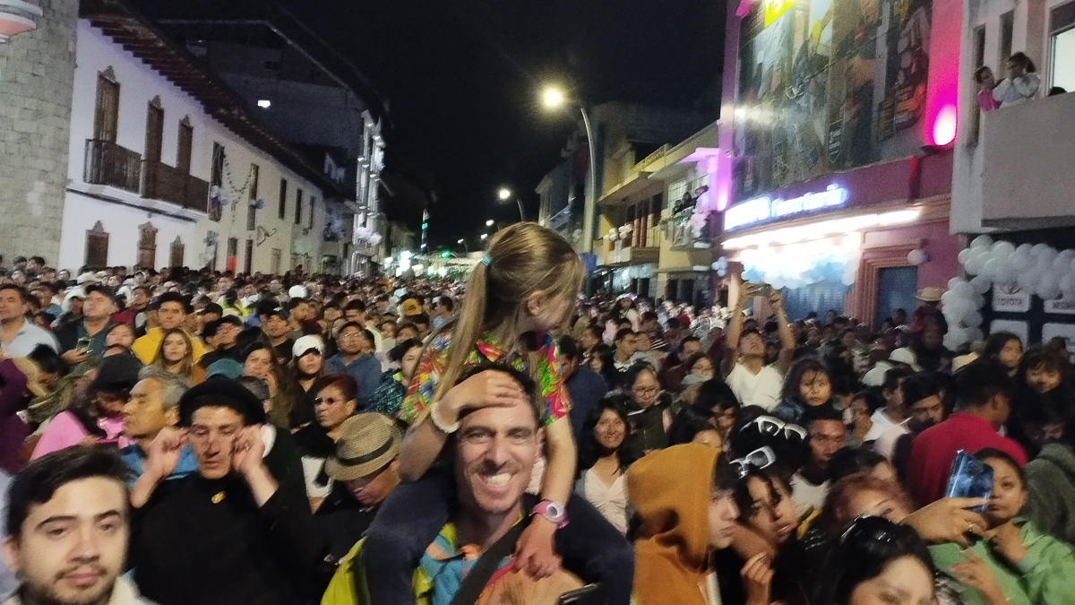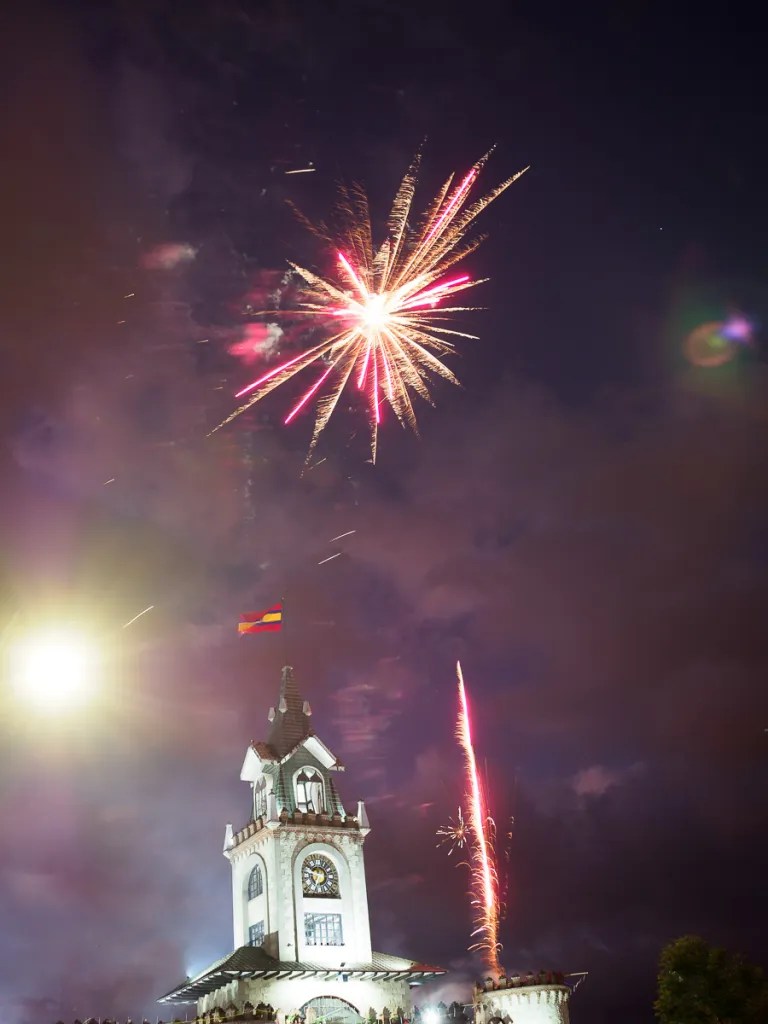 Nous nous dirigeons vers la Puerta de la Ciudad, un autre point emblématique de la ville pour attendre la vierge. L’ambiance est familiale et agréable, l’armée défile ainsi que plusieurs fanfares et groupes folkloriques de danse. Pas facile d’apercevoir quelque chose au vu de la foule. Un magnifique feu d’artifice accueille enfin l’icône religieuse, resplendissante dans ses habits de soie. Voir autant de monde réuni pour le défilé de la vierge del Cisne est un moment fort et très émouvant. Nous la suivons des yeux quand elle passe devant nous, frêle mais porteuse de foi et d’espoir. Nous suivons la procession quelques instants avant que ne s’achève pour nous cette belle soirée. Le téléphone portable de Damien a disparu… un quart de seconde d’inattention pour écarter les filles de la foule…et il l’a peut être fait tomber… ou se l’est fait voler, on ne sait pas trop… Nous rentrons déçus à notre logement pour sécuriser nos données. C’est rageant bien sûr mais uniquement matériel, il n’y a eu aucune violence et ça aurait pu nous arriver dans n’importe quel rassemblement.