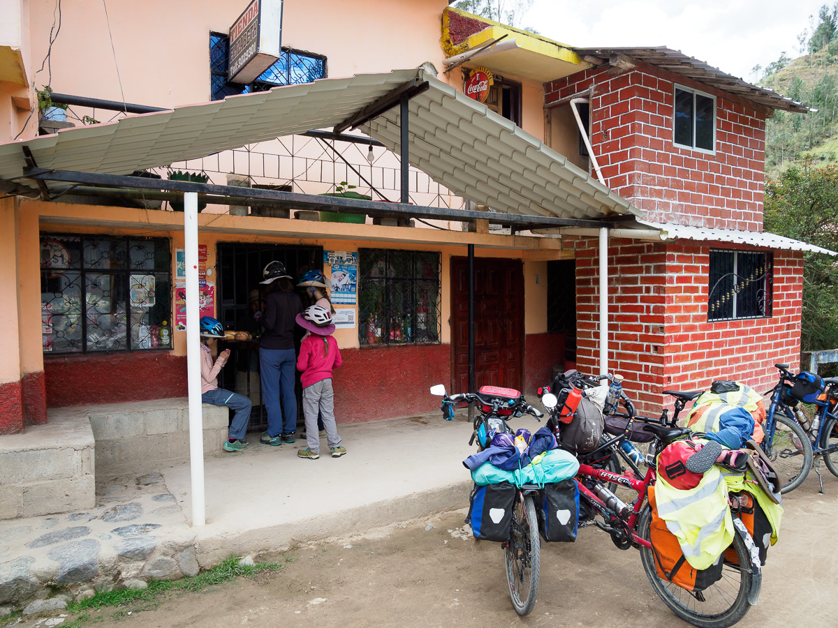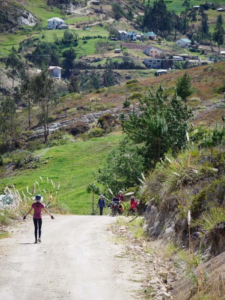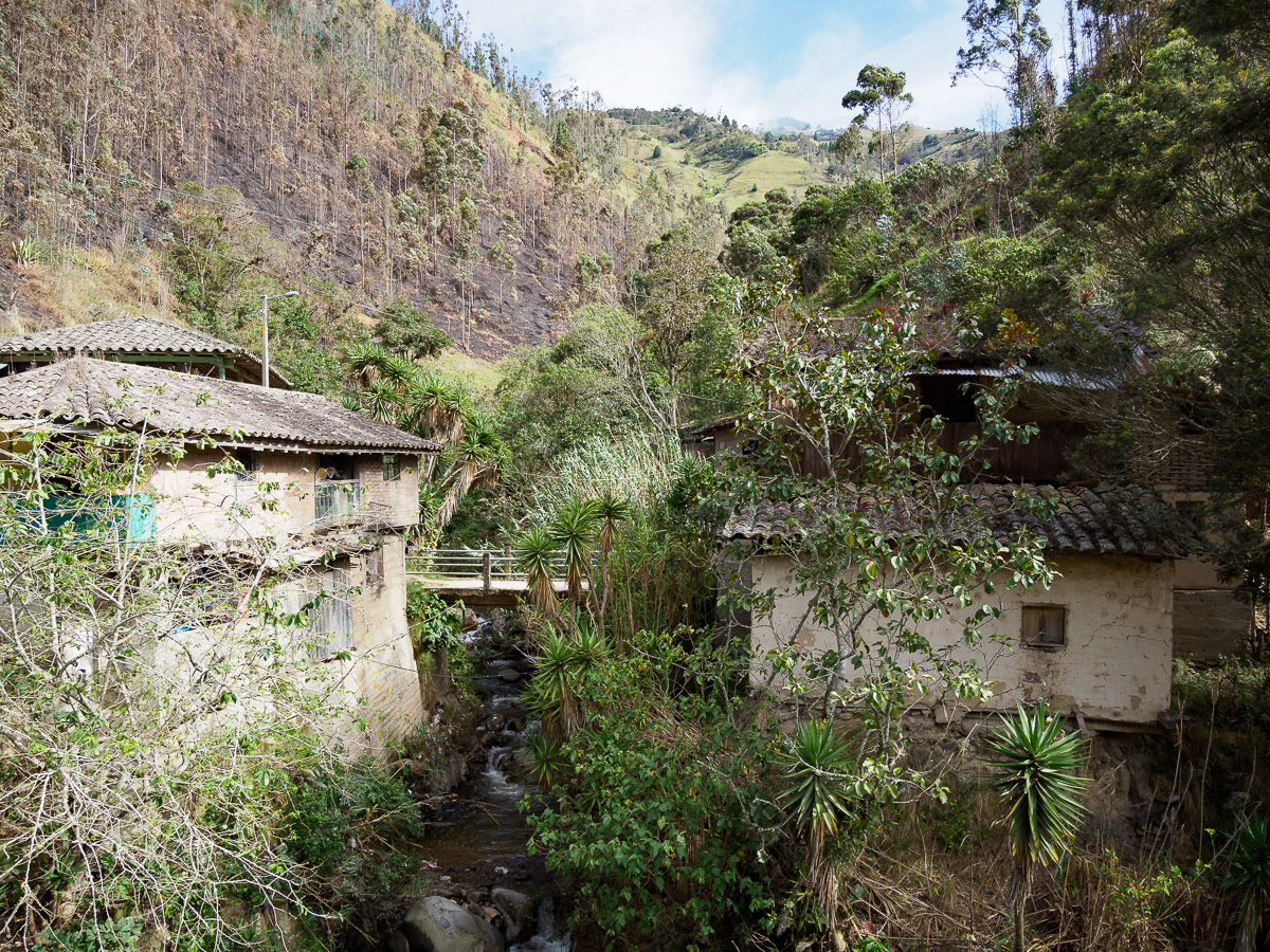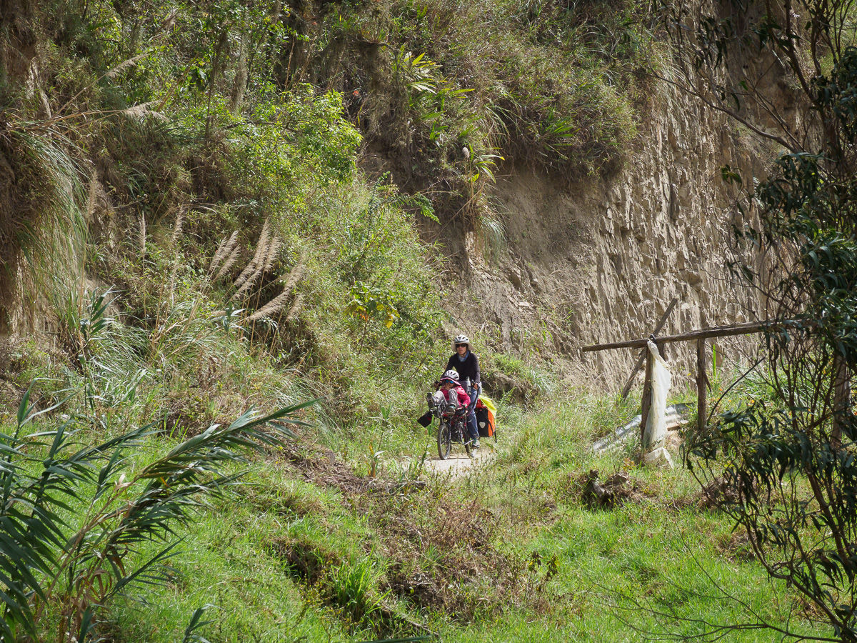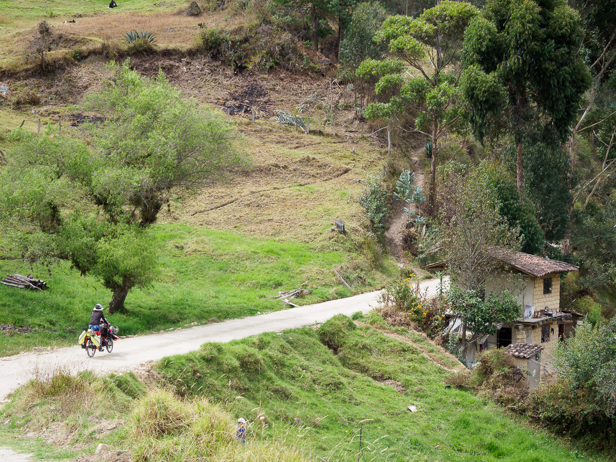 Peu à peu, un relief plus caillouteux se dessine, nous descendons entre des blocs de roches et des ruisseaux aux eaux cristallines. Quelques bosquets de sapins font leur apparition. Nous nous croirions dans un nouveau pays… Ces immensité sauvages en haute altitude m’impressionnent et me comblent. Comme en Colombie, quitter ces paramos est un petit déchirement pour moi, comme si j’y laissais un peu de mon âme. Y rester contribue au contraire à m’imprégner de leur force et de leur tranquillité. J’en ressors toujours plus apaisée et ressourcée… Mais, les considérations plus terre à terre de ma famille me pousse à revoir mes envies. Nous ne bivouaquerons pas une nuit de plus ici. Lucie a envie d’un lit et d’une salle de bain. Manon rêve d’un bon repas. Nous avons encore de quoi manger mais sans les petits plus qui font la différence, comme cacahuètes, fèves séchées ou fruits frais. Ma quinoa et mon avoine ne font pas le poids face à la promesse de frites et de pains frais. Alors nous descendons, moi la tête dans les nuages, elles l’estomac dans les talons. Quelques maisons sont le signe du retour à la civilisation avec leur maïs et leur linge qui sèchent conjointement au balcon.