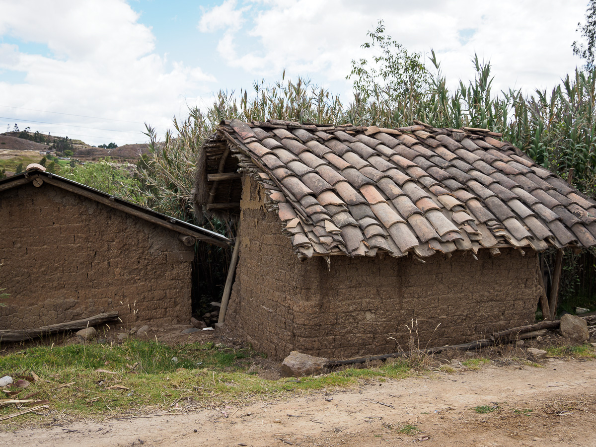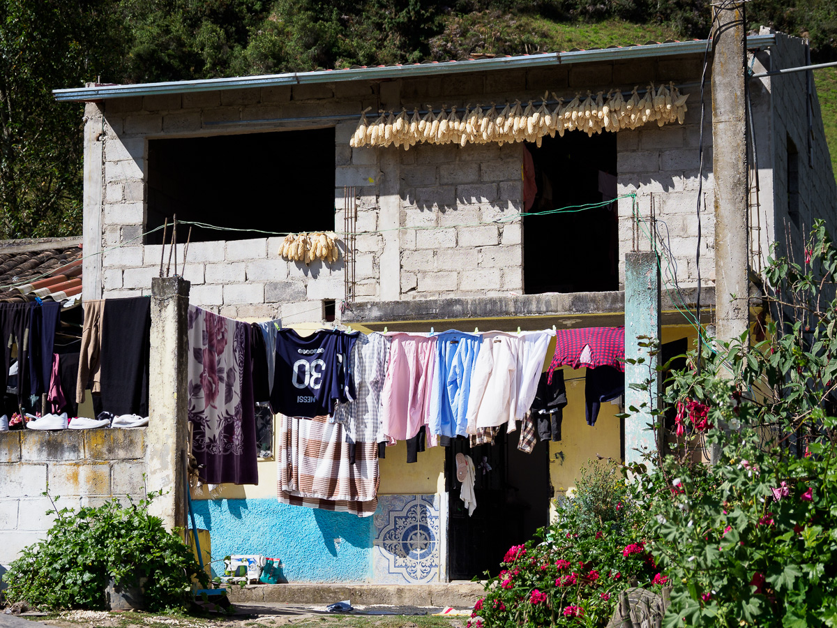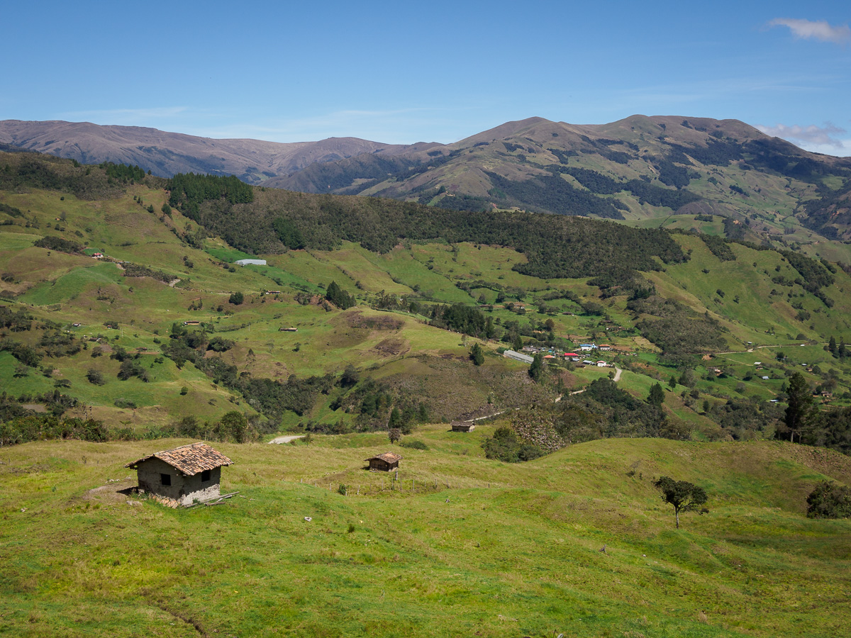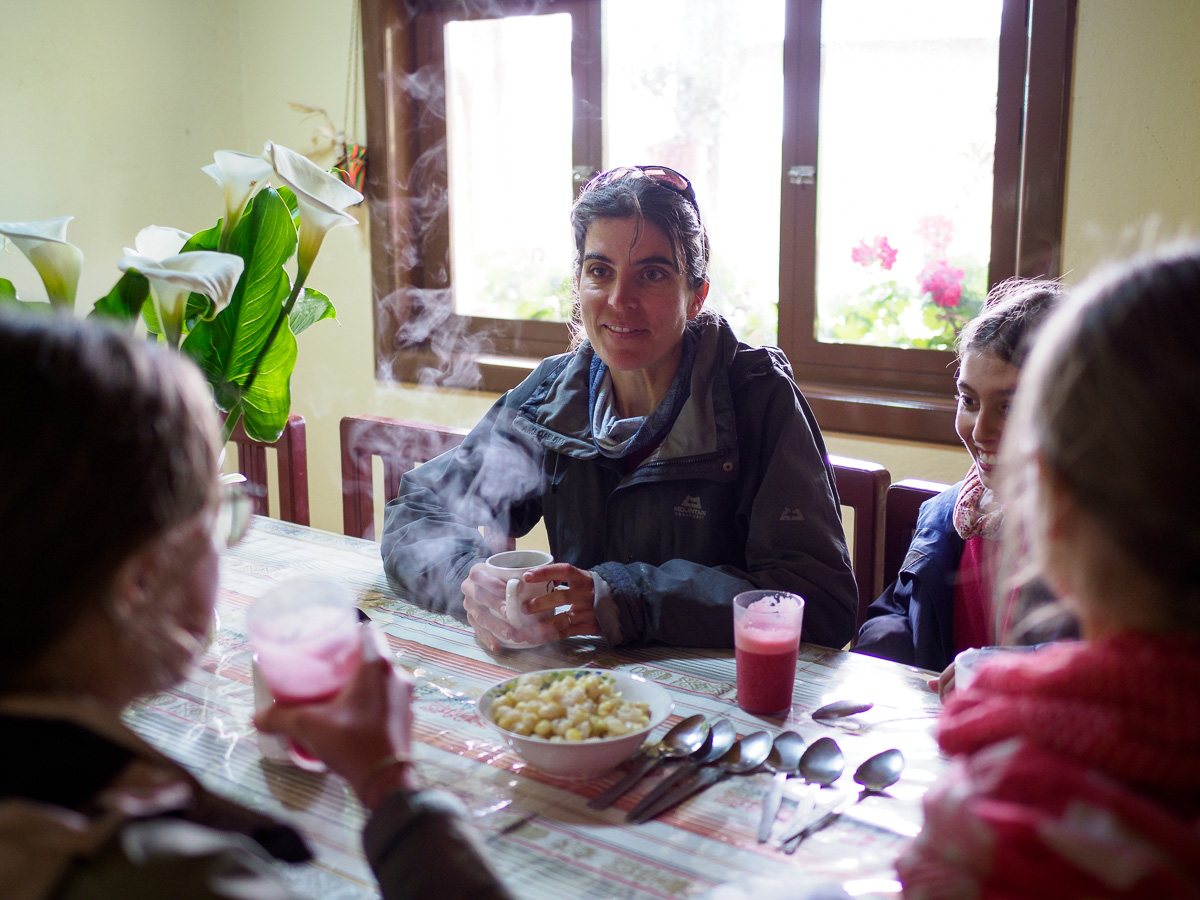 Peu à peu, un relief plus caillouteux se dessine, nous descendons entre des blocs de roches et des ruisseaux aux eaux cristallines. Quelques bosquets de sapins font leur apparition. Nous nous croirions dans un nouveau pays… Ces immensité sauvages en haute altitude m’impressionnent et me comblent. Comme en Colombie, quitter ces paramos est un petit déchirement pour moi, comme si j’y laissais un peu de mon âme. Y rester contribue au contraire à m’imprégner de leur force et de leur tranquillité. J’en ressors toujours plus apaisée et ressourcée… Mais, les considérations plus terre à terre de ma famille me pousse à revoir mes envies. Nous ne bivouaquerons pas une nuit de plus ici. Lucie a envie d’un lit et d’une salle de bain. Manon rêve d’un bon repas. Nous avons encore de quoi manger mais sans les petits plus qui font la différence, comme cacahuètes, fèves séchées ou fruits frais. Ma quinoa et mon avoine ne font pas le poids face à la promesse de frites et de pains frais. Alors nous descendons, moi la tête dans les nuages, elles l’estomac dans les talons. Quelques maisons sont le signe du retour à la civilisation avec leur maïs et leur linge qui sèchent conjointement au balcon.