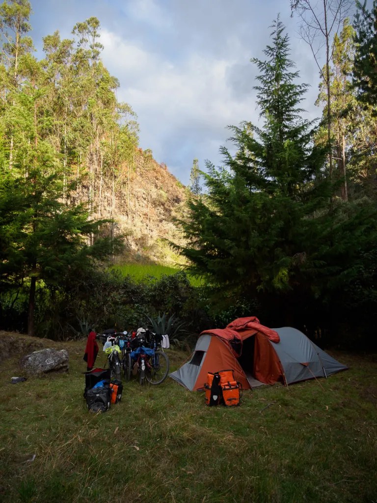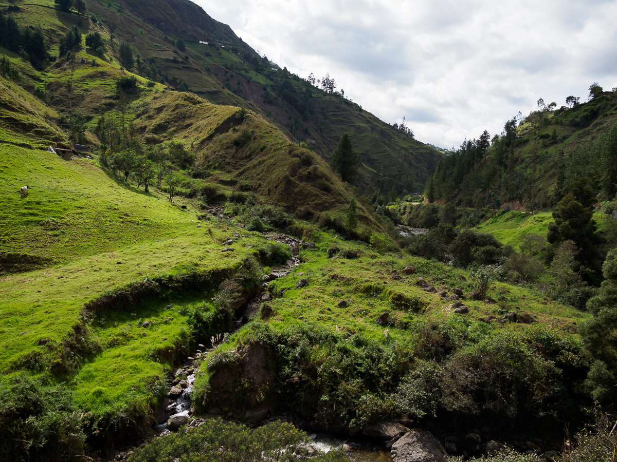 Nous descendons une belle vallée, de plus en plus encaissée et aux pentes vertigineuses, nous rappelant la Colombie. Les bananiers font leur apparition, nous sommes à moins de 2500 mètres d’altitude pour la premiere fois depuis longtemps. Nous nous éloignons de la rivière en même temps que de nos rêves de bivouac près de l’eau. Il se fait tard et aucun coin ne nous satisfait. Enfin, vers 17h30, un chemin rend la rive accessible. C’est plat et bucolique avec quelques vaches amarées et la musique des flots pour nous bercer. Nous ne nous en approcherons pas trop, cette rivière traverse Loja et sa coulelur et quelques relents d’odeur ne nous inspirent pas.