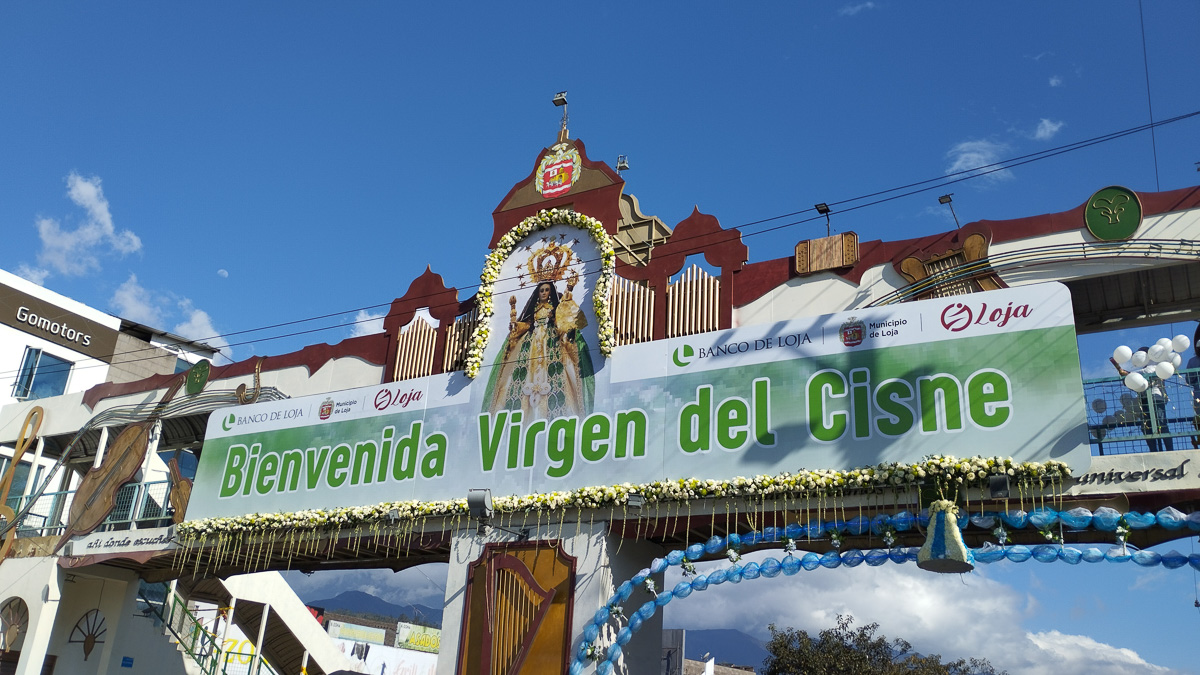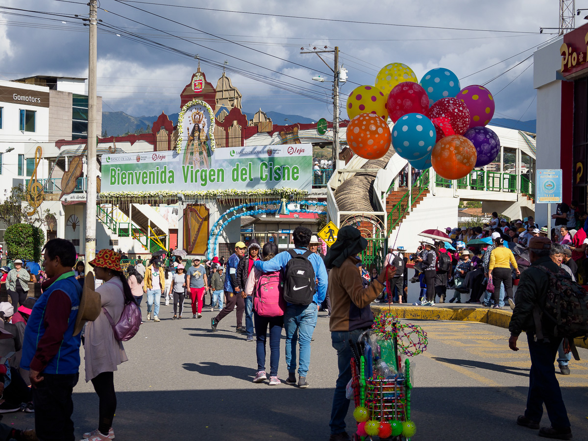 Demain, arrive à Loja, la vierge del Cisne, partie le 15 Août de son sanctuaire et suivie par des milliers de pélerins à pied. L’occasion d’une nouvelle immersion culturelle. Ce n’est pas si facile d’obtenir des informations sur l’heure exacte de son entrée dans la ville en ce samedi 26 août. Alors, nous nous rendons sur la place de la cathédrale, encore en pleine préparation à 16h00. Peu de monde en centre ville… Où est donc passée la population ? En attendant, nous nous rendons au terminal terrestre pour prendre des informations sur notre bus de retour à Quito. Eh bien, c’est ici que se trouve tout le monde, c’est en fait la première étape de la vierge. Il y a foule et le terminal grouille de vie.