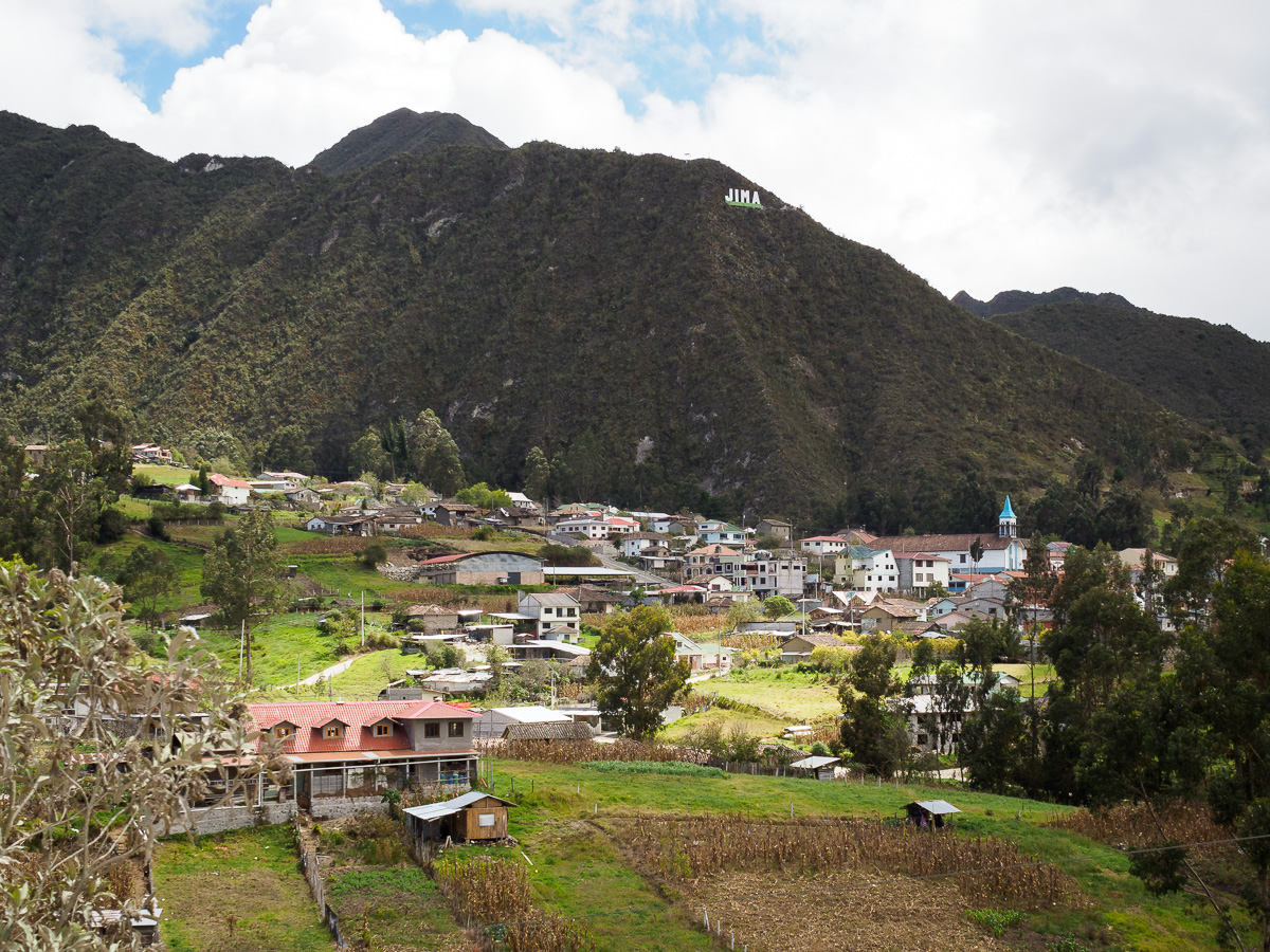 La brume s’accroche aux sommets, les paysages sont beaux par leur simplicité. La pluie s’est calmée. Nous remercions cette gentille famille et continuons par une montée sauvage avant une belle descente vers le village de Jima. Une belle surprise que cette bourgade comme on les aime: une belle place, une boulangerie/café pour un deuxieme petit déjeuner, des maisons coloniales et des habitants accueillants. Un superbe mirador surplombe la ville. L’épicier nous offre 4 paquets de gateaux. Et Nancy nous invite à manger chez elle. Sa famille vient de récolter le maïs qui sèche sur le balcon. Il leur permettra d’être autonome en « mote » toute l’année. Près de l’entrée, un immense four est utilisé pour cuisiner le fameux hornado ou cochon rôti! Nous passons un excellent moment ensemble!!