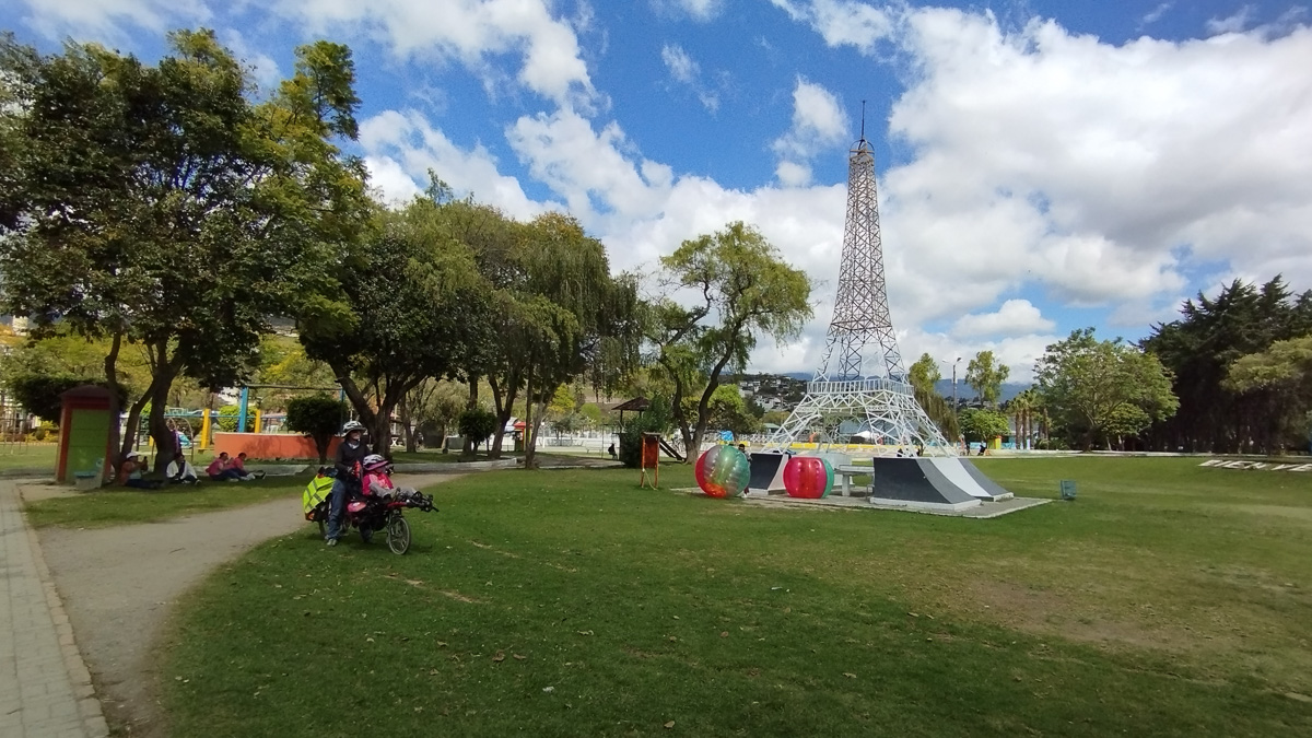 Après une zone de travaux poussiéreuse, nous rentrons dans Loja par un beau sentier écologique qui nous mène directement dans le parc Jipiro, celèbre pour ses reproductions de monuments célèbres. Il fait bon à l’ombre des pins, entre jeux et pique-nique.